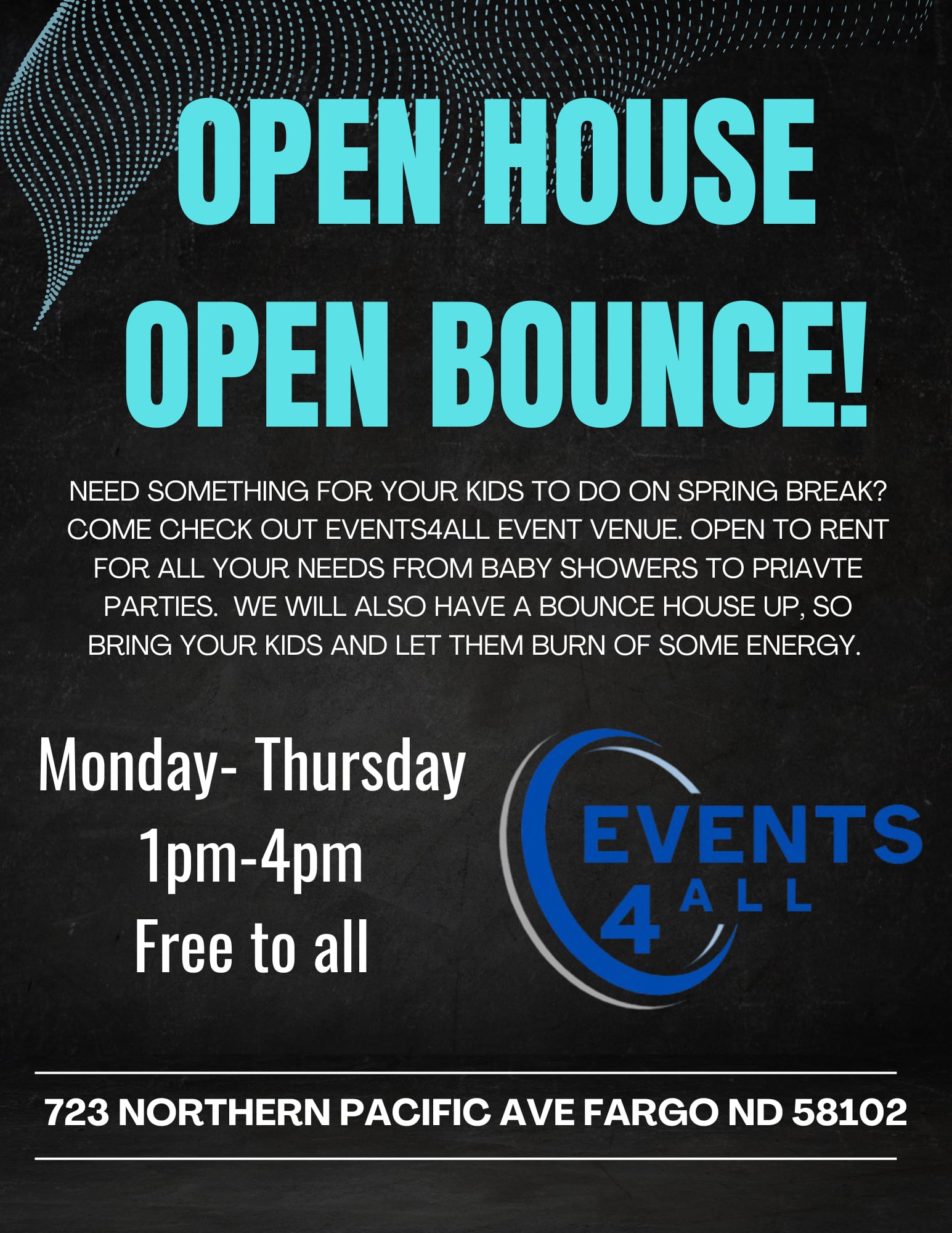 Looking for something fun (and energy‑burning!) for the kids during spring break? Swing by Events4All and check out our event space while the little ones bounce and play!