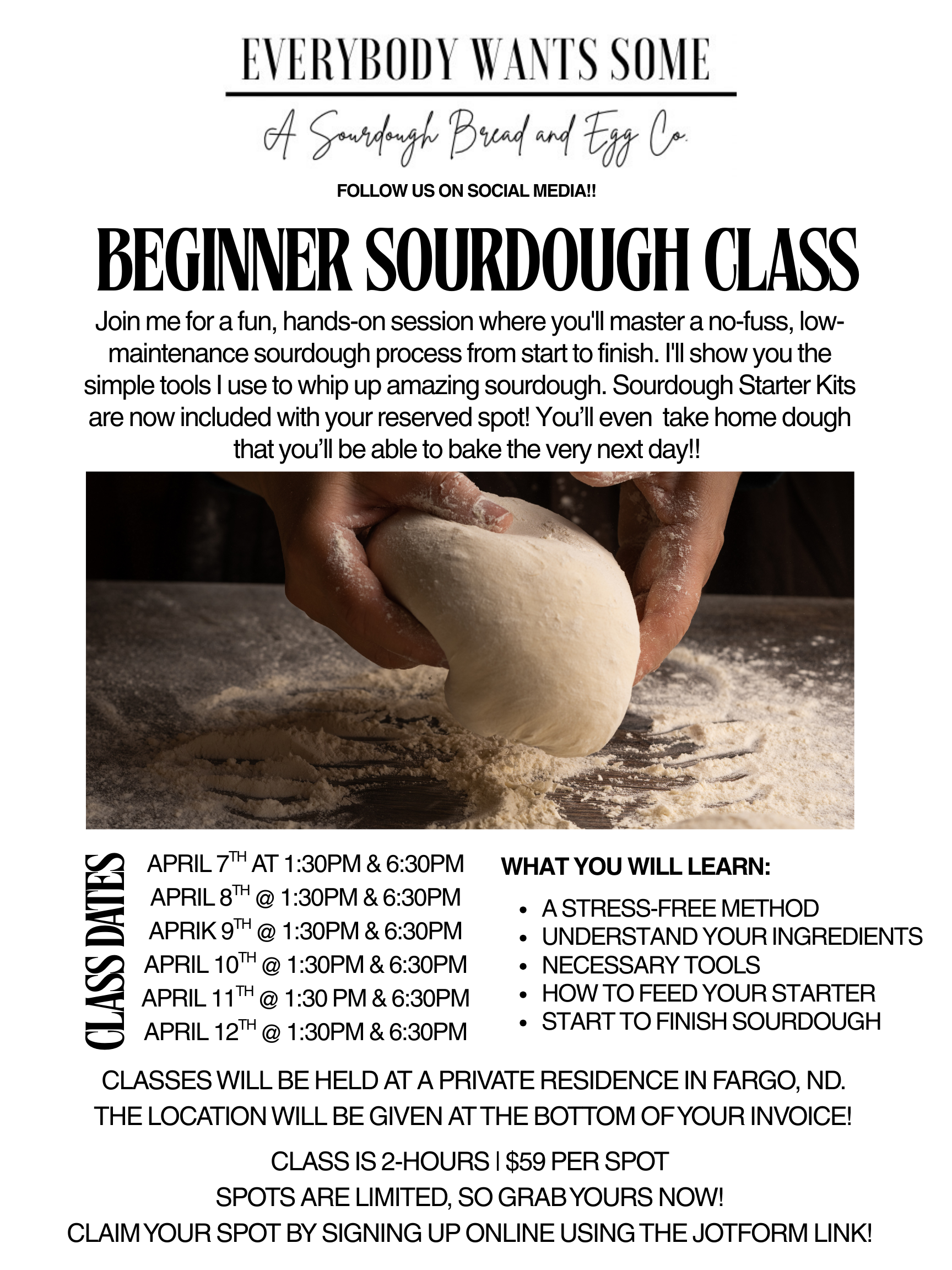 Hey Fargo friends! I’m excited to announce I’ll be hosting several small, intimate sourdough bread classes at a private residence in Fargo, ND! (Address will be provided upon booking!)