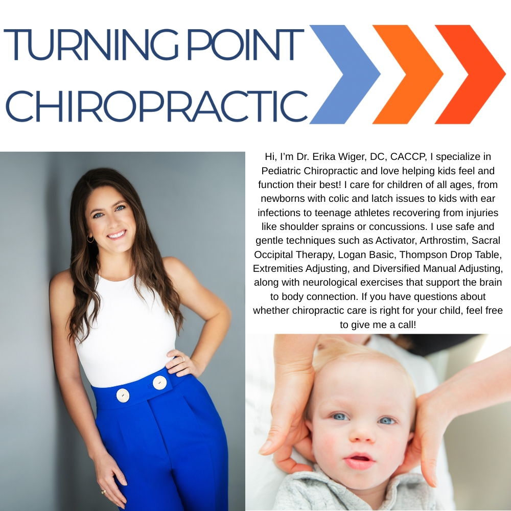 Turning Point Chiropractic provides gentle and safe chiropractic care designed to support growing spines and developing nervous systems. Dr. Erika specializes in Pediatric Chiropractic, offering a variety of adjusting techniques for infants, toddlers, and older children to help with comfort, mobility, and overall well-being. From newborn colic and feeding challenges to posture concerns, immune system issues, and active kids with big daily demands, each child receives a tailored approach. Turning Point Chiropractic is a place where families feel supported, informed, and confident in their child’s health.