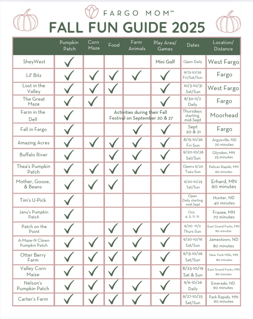 Pumpkin season is here! We’ve got a list of all the great pumpkin patches in Fargo and beyond to help you create memories with the kiddos. Whether it’s local pumpkin patches in Fargo or Moorhead or a nearby location you can make a day trip out of, we’ve got a list of all the great spots near you!