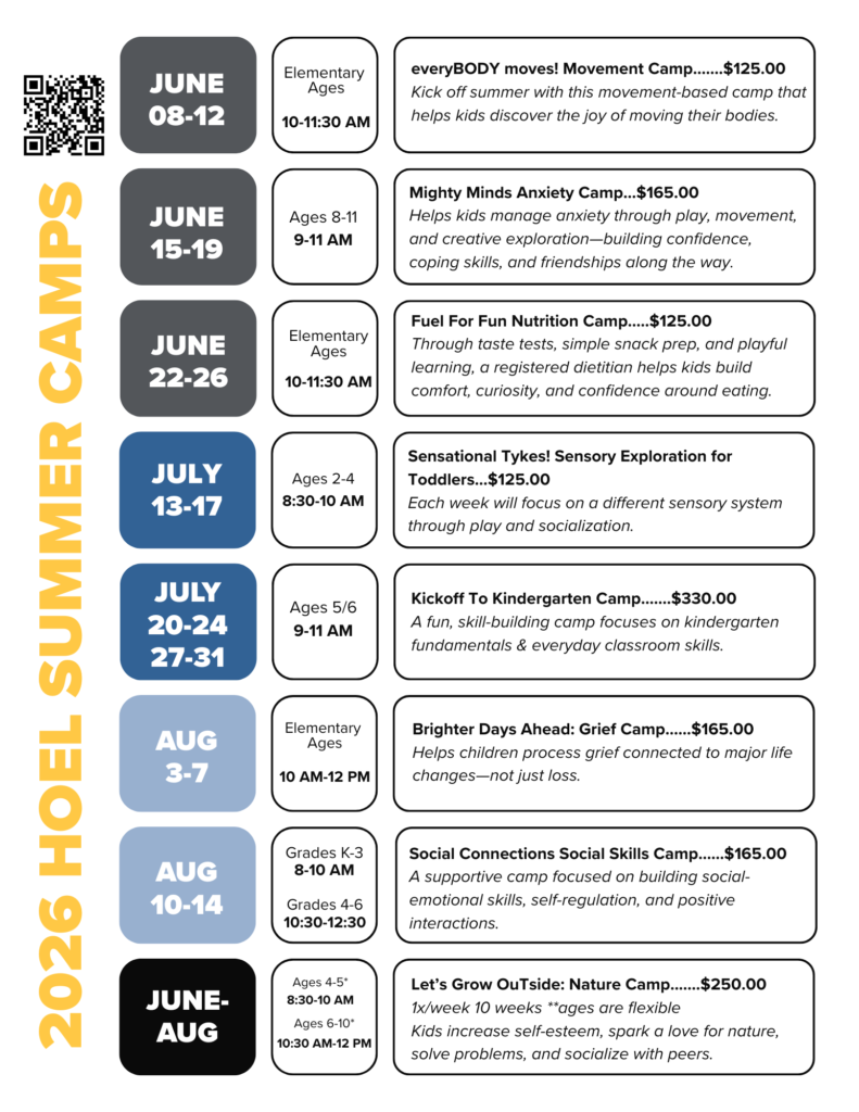 HOEL partners closely with trusted local providers such as Beyond Boundaries Therapy & Wellness, Music Therapy in Motion, LLC and NDSU Bison Strides to offer programming that supports the whole child: physically, emotionally, socially, and developmentally.